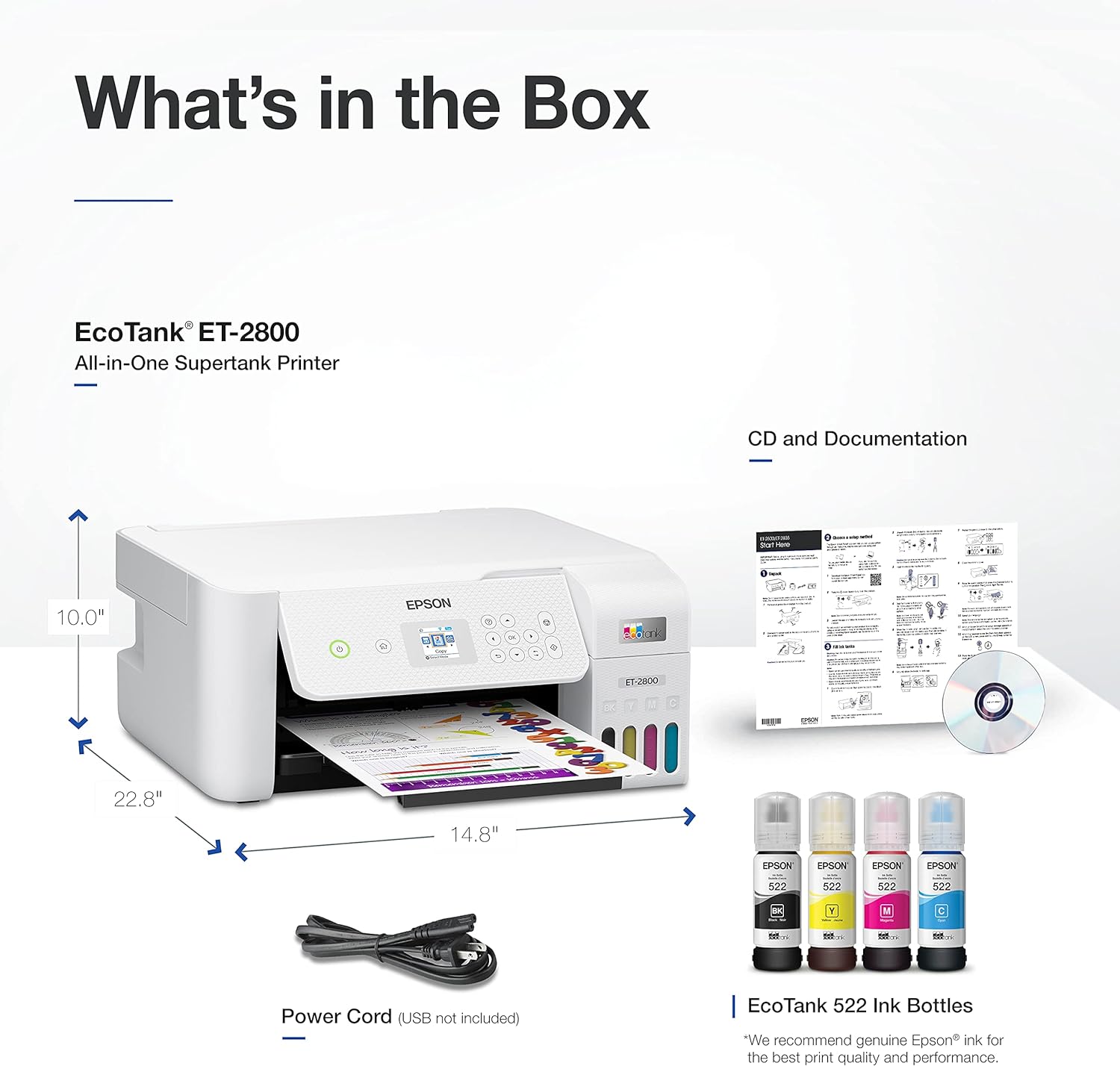 The Epson EcoTank ET-2800 is a powerful and economical all-in-one printer built for modern workspaces that demand efficiency and reliability. Unlike traditional cartridge-based printers, this model features Epson’s innovative EcoTank system, allowing users to refill ink tanks easily and significantly reduce printing costs over time.